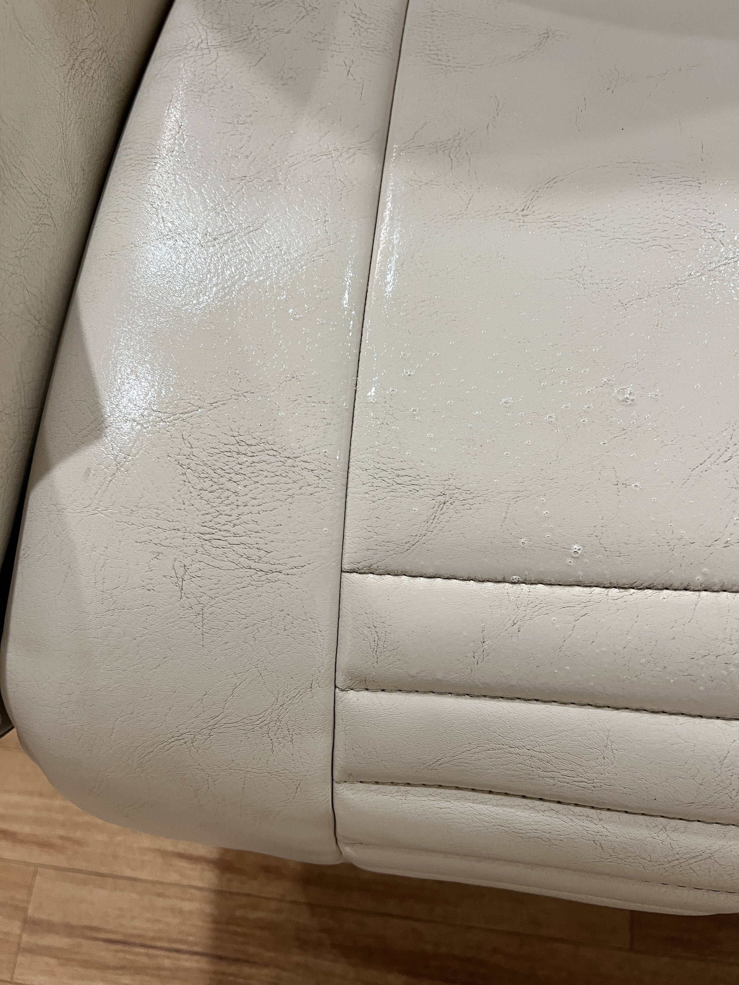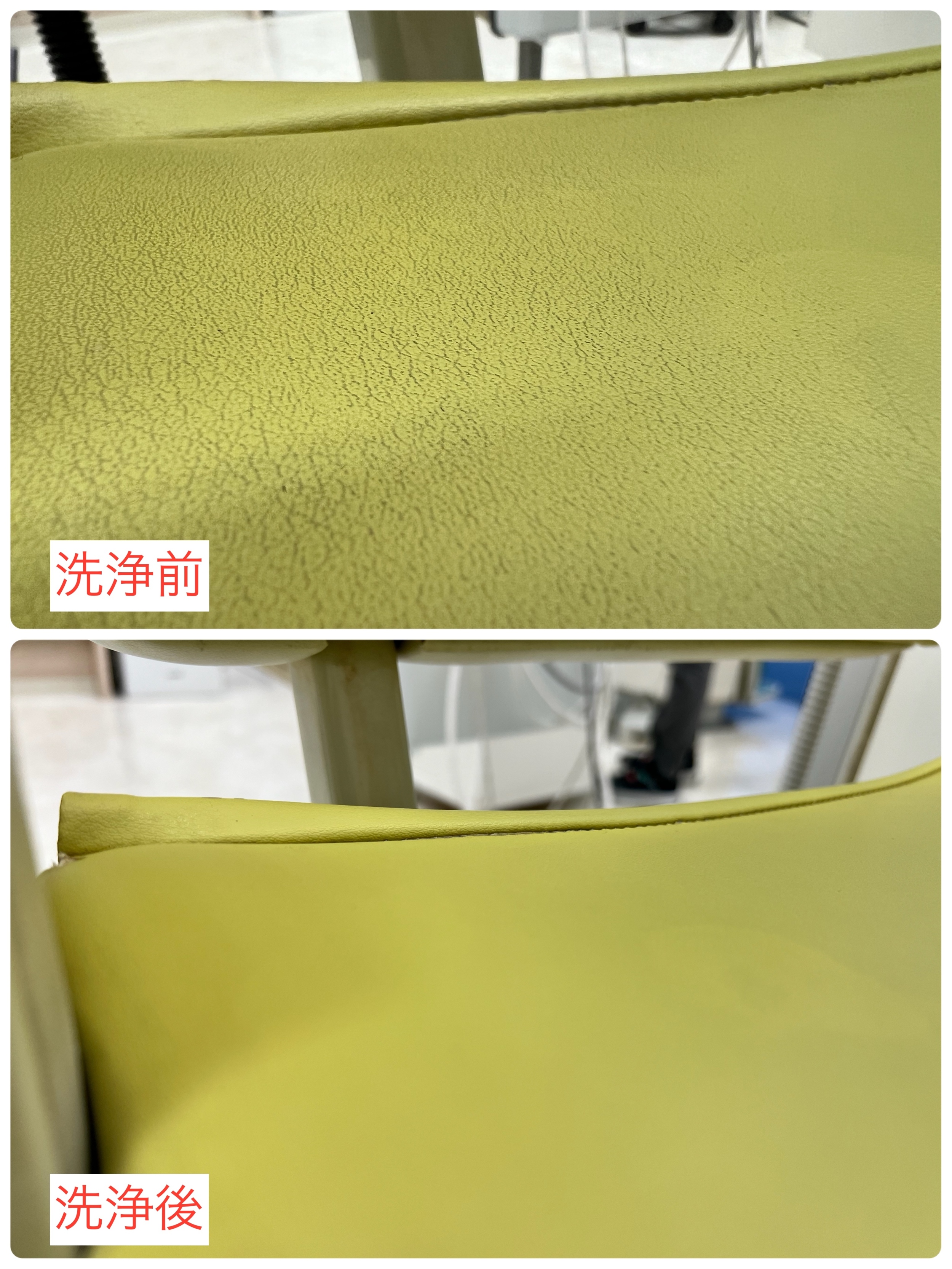 アルコールで清掃されているクリニック様がとても多いですが、アルコールだと合皮のシートは傷みますし汚れもほとんど落とせません。
